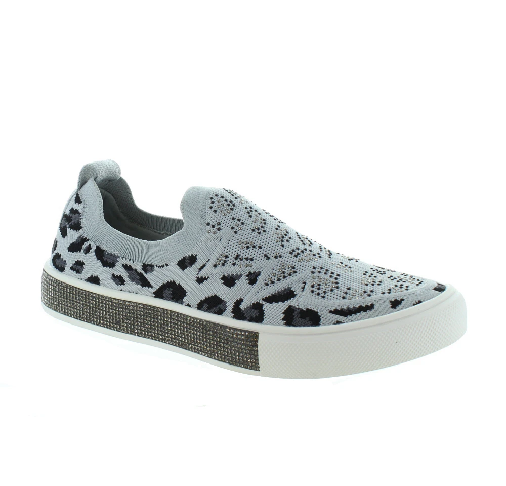 This Bernie Mev leopard shoe is a great statement shoe. It features sequin details on a grey knit upper, a bedazzled side sole, and a comfortable insole. Pair them with a basic outfit to show off your new shoes.