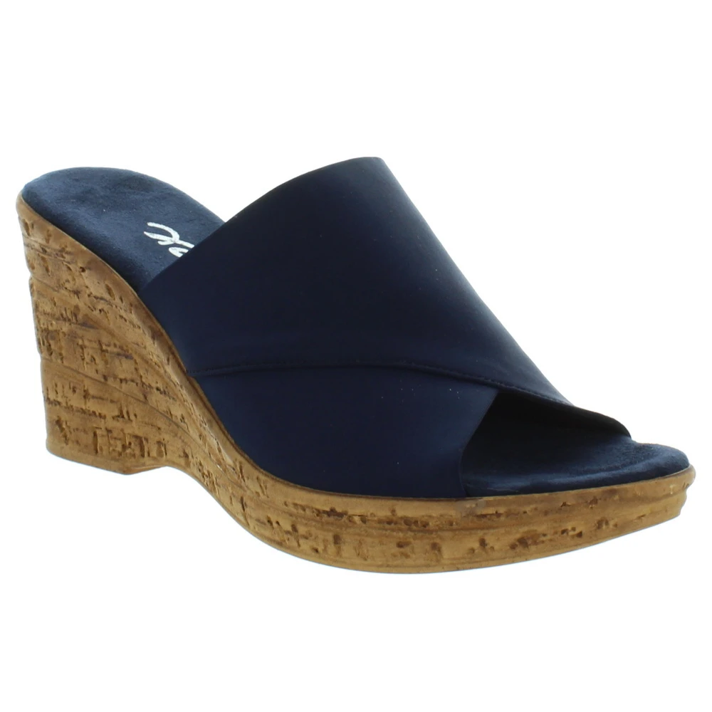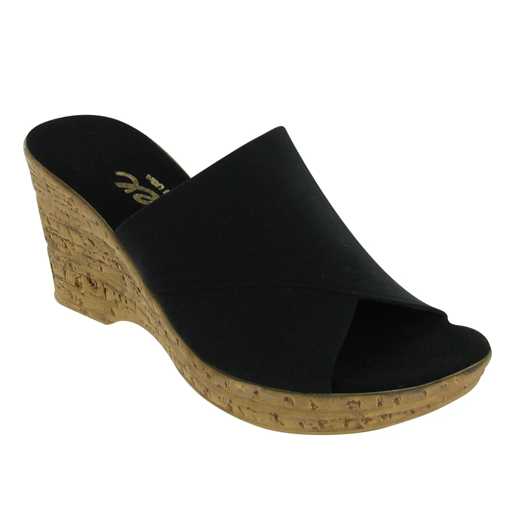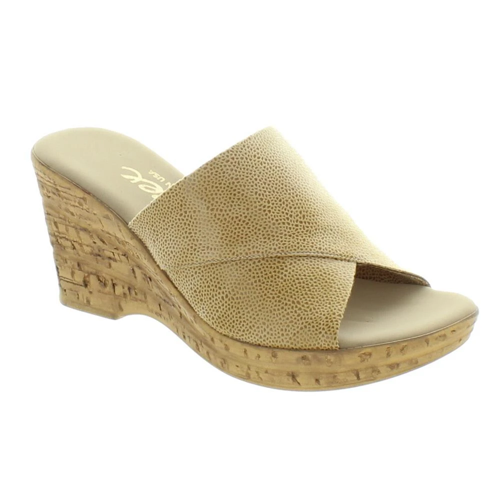 Cork-textured wedge with a crossover elastic strap, open toe and padded footbed. height: 3` with 3/4` platform. The beige upper has a very subtle print.