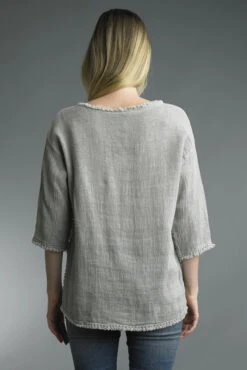 An elegant top with a built in side tie that accentuates the waist. The hemline really hugs the hips to provide that blouson body effect for plenty of breathing room. Wear it with a pair of patterned flowy pants or slim skirt. The top is made from Clara Sunwoo`s signature soft stretchy poly blend fibers. Care is easy, lightweight, and wrinkle free.