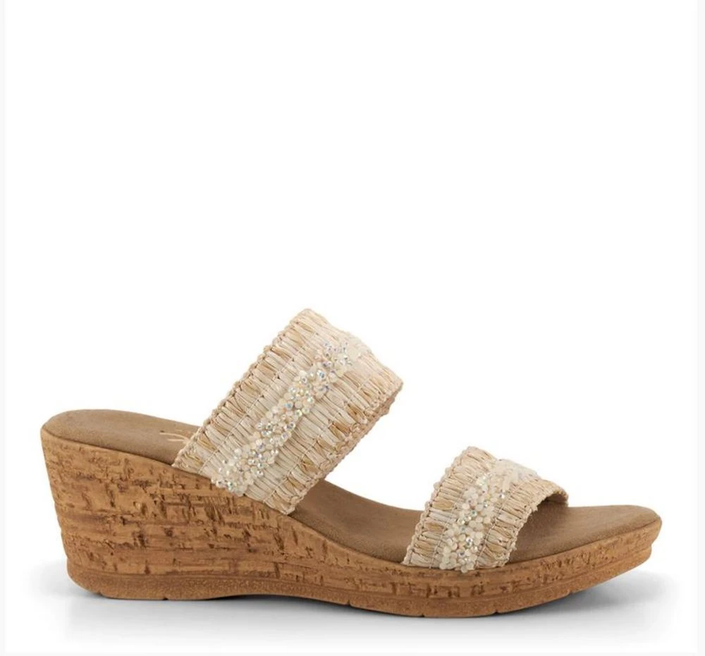 Slip into this soft beachy wedge. Features a raffia two-band upper with rhinestone detail. Easy slip on style with a 2 1/4 inch heel height. Pair with a maxi dress and sun hat.