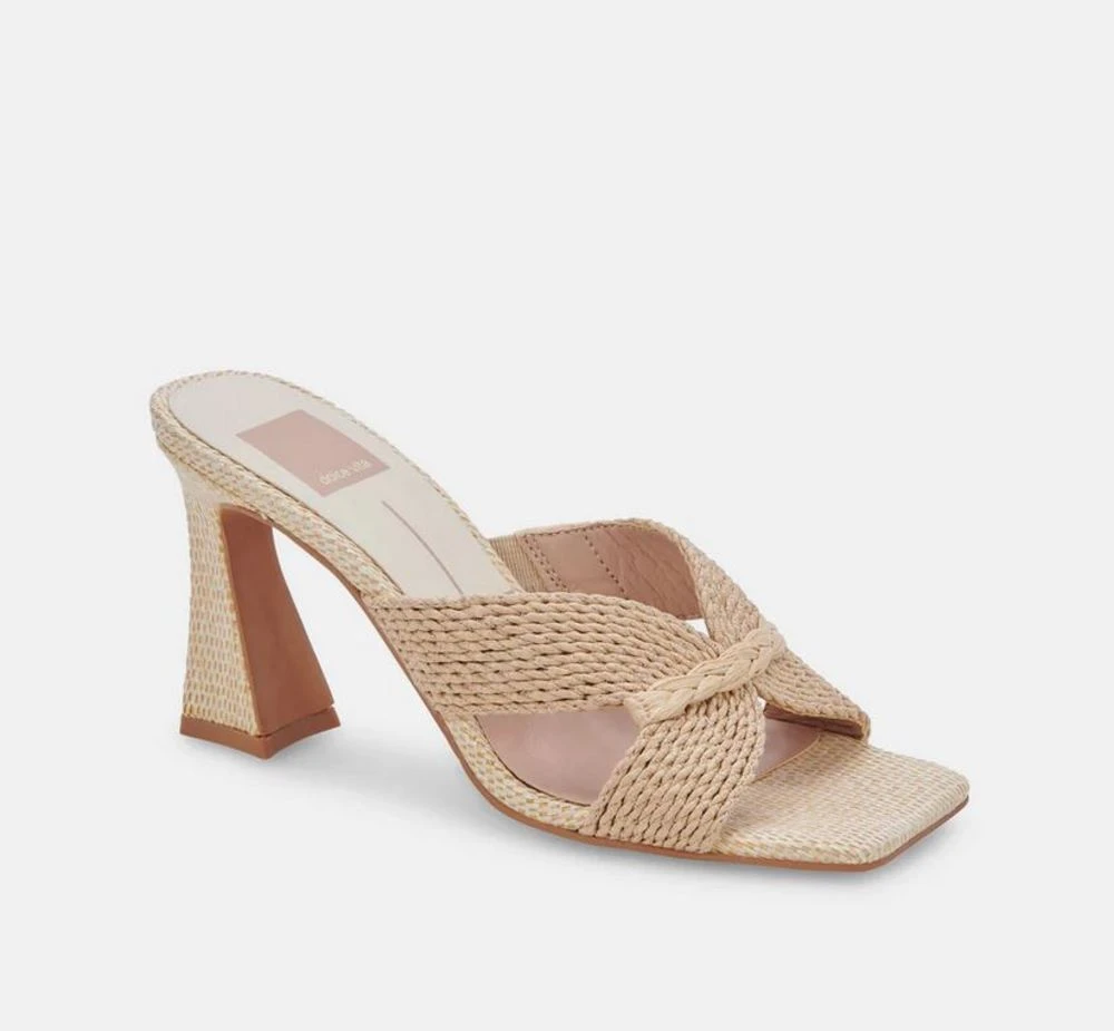 A gorgeous bright raffia heel for the summer. Features a raffia and textile upper, as well as a recycled synthetic outsole. Water-based leather lining and a 3.2 inch heel height. Pair with a maxi skirt and a tank.