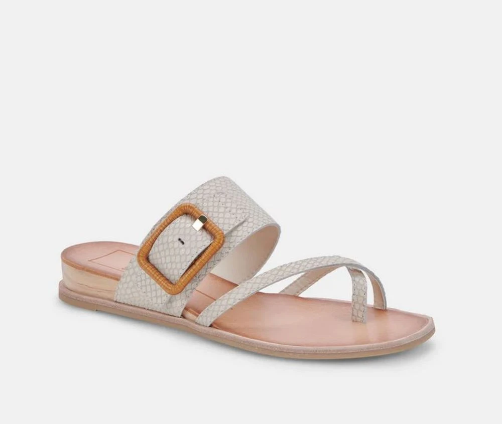 This dainty sandal features crisscross straps and a chunky buckle emblazement. Easy slip on and off style and a snake skin design on straps add fun detail. Leather upper and 1 inch heel height.