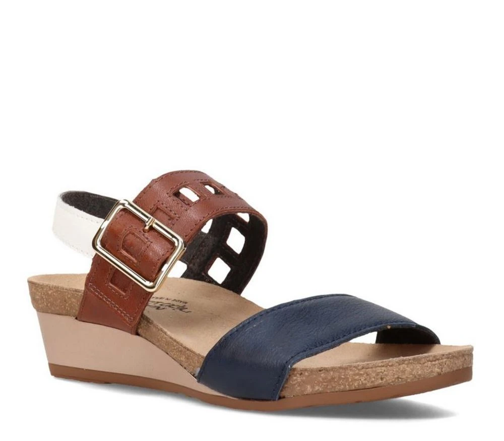 Cute summer-ready sandals are here. The Dynasty is a slingback sandal featuring a large buckle embellishment. A low wedge heel measuring 1.75 inches gives a slight lift while still providing all day comfort. Polyurethane outsole and a leather upper and lining.
