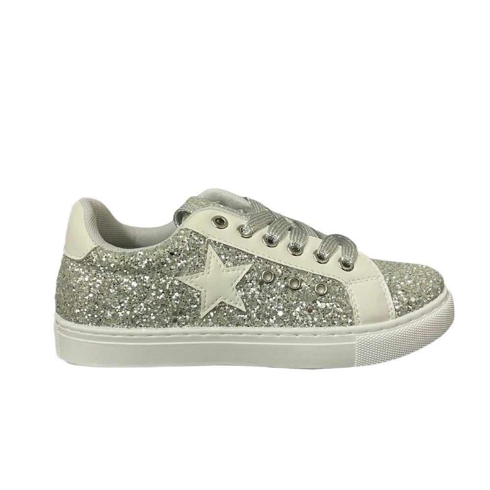 Super lightweight and comfortable, this fashion sneaker features a silver glitter design and embroidered star detail. An adjustable lace up closure for the perfect fit and faux leather upper. Pair with a skirt or jean shorts.