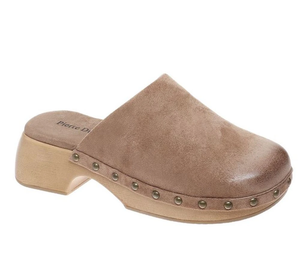 This stylish clog features a faux suede upper and bronze embelsihments. A two inch heel and closed toe design. Padded footbed and rubber outsole for traction. Pair with shorts or jeans and a cute top.