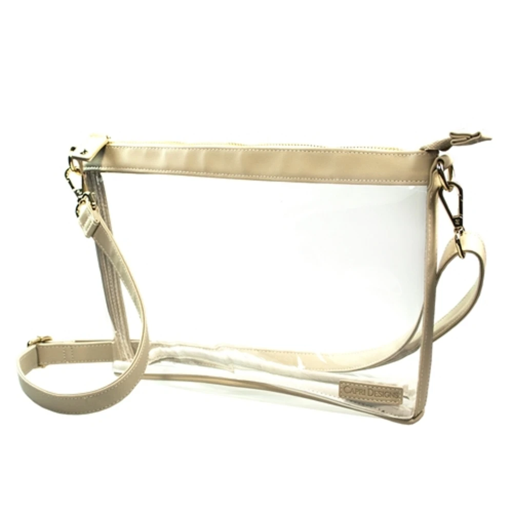 Our crossbody features a clear PVC body with classic accents of Vegan Leather and silver hardware. The main zippered compartment is perfect for securely storing your personal items. Easily convert your accessory from a crossbody to a clutch with the adjustable and detachable Vegan Leather strap. Measures 10` x 7.25” x 2.375`