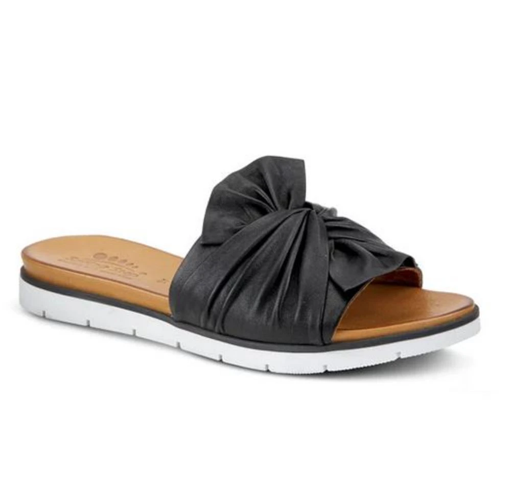 This adorable slip on sandal features a leather upper and bow twist detail. A flexible outsole and v-goring under bow allows for the perfect adjustability. Heel height 1 inch.