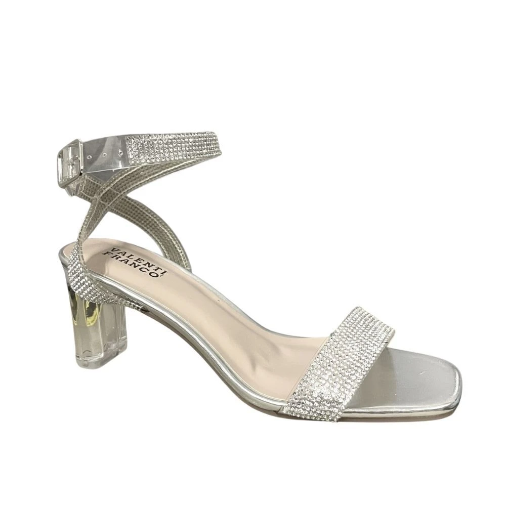 An evening heel taken to the next level. This low heel will keep your feet comfortable all night long, measuring just 2.5` tall. Features a crystal clear heel and a rhinestone upper and ankle strap. A crisscross strap that goes around the back of the heel adds an elegant look to the shoe. Pair with a dress or skirt.