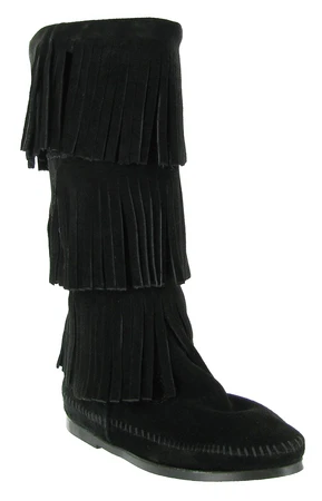 This boot features Suede upper/crepe sole and three tiers of fringe cover the tall shaft.