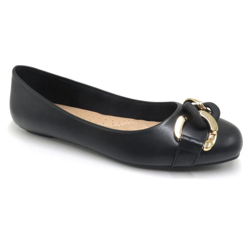 This simple, elegant flat features a synthetic upper and gorgeous gold embellishment. An easy slip on style for anyone on the go. Padded footbed for all day comfort. Pair with skinny jeans or a dress.