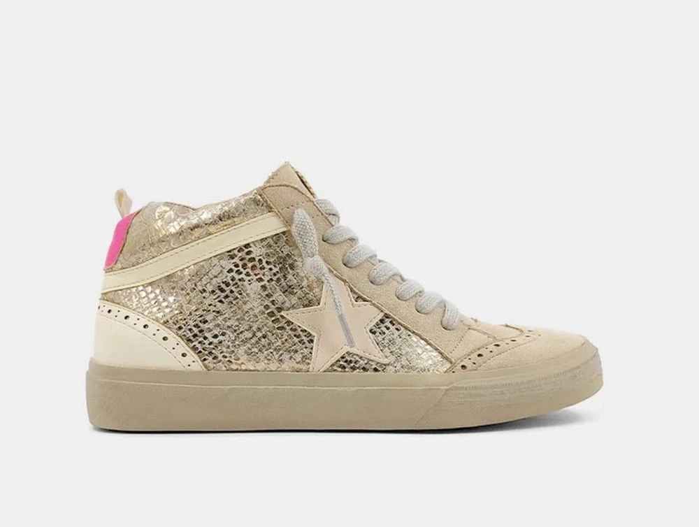 Inspired by vintage basketball shoes but with a TWIST. These cool sneakers features a hi-top design and multiple texture combinations. Faux metallic snakeskin with a star embellishment. Hot pink heel tab and grey lace closure.
