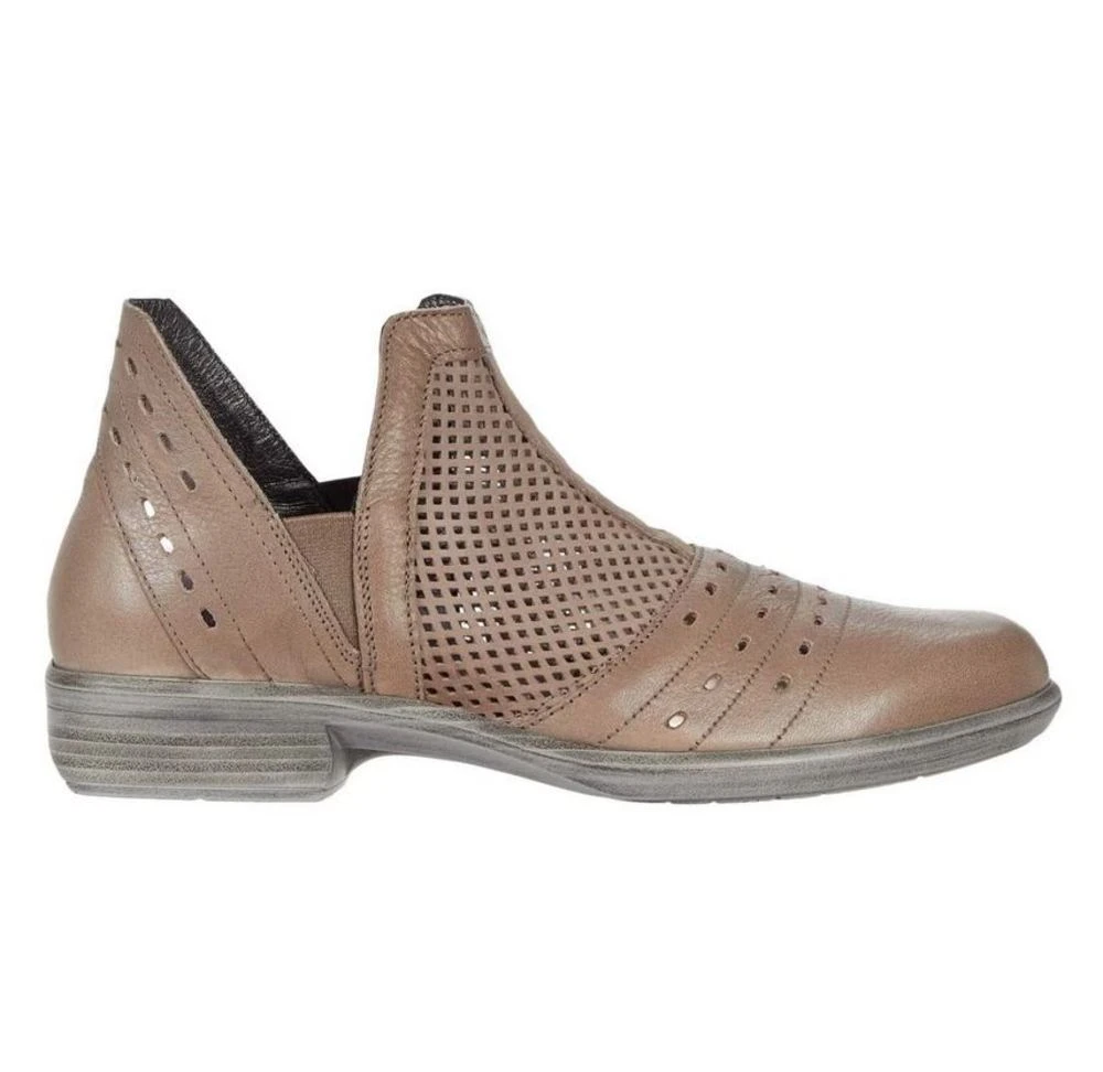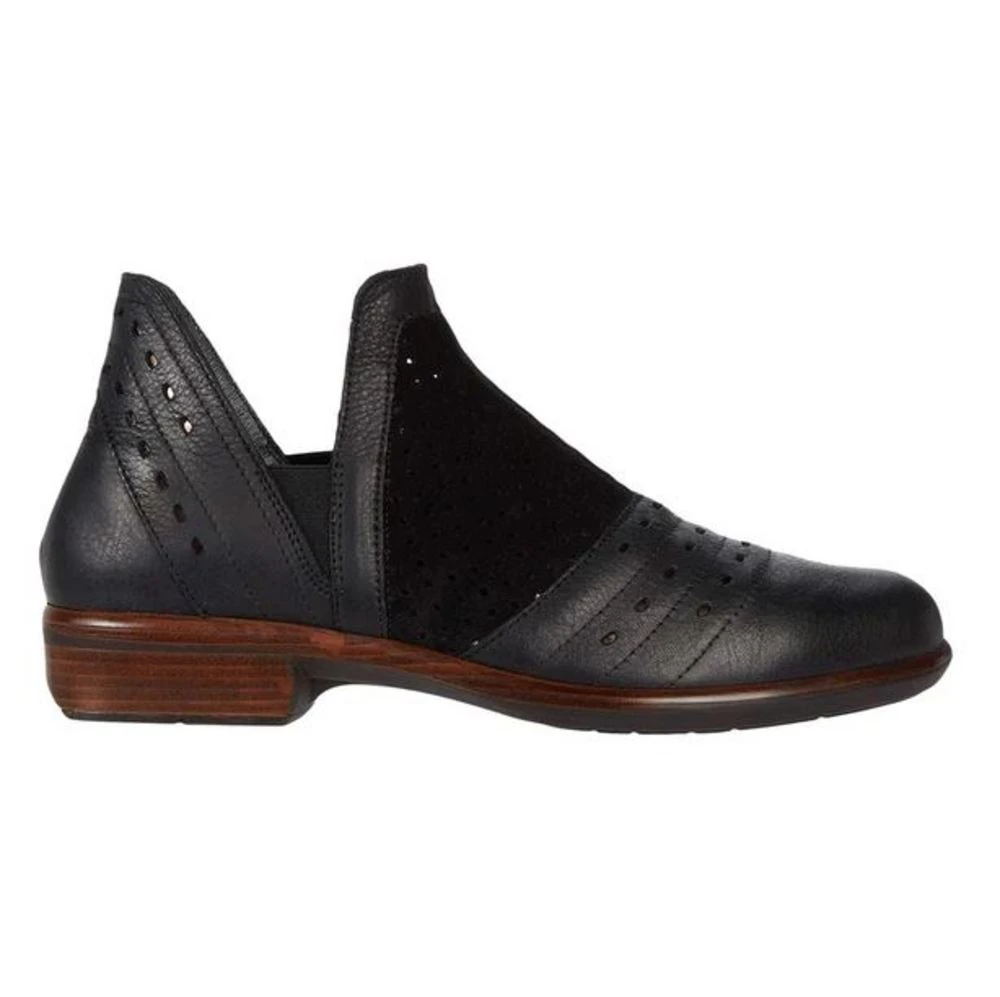 This stylish slip-on bootie features a sleek leather upper and suede perforations. Hand-sewn strobel construction making this shoe super flexible for all day comfort. Easy on and off and breathable leather lining. Anatomic cork and latex footbed wrapped in suede and molds to every step. Polyurethane outsole.