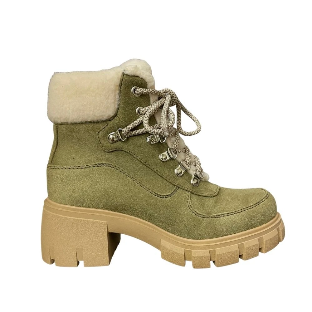 An edgy hiker boot featuring a faux fur lining is the perfect way to complete any winter outfit. A 2 inch heel makes for an easy day or night on the town and a diamond pattern lace adds the perfect amount of detail. Inside side zipper for easy on and off. Pair with black jeans and a sweater.
