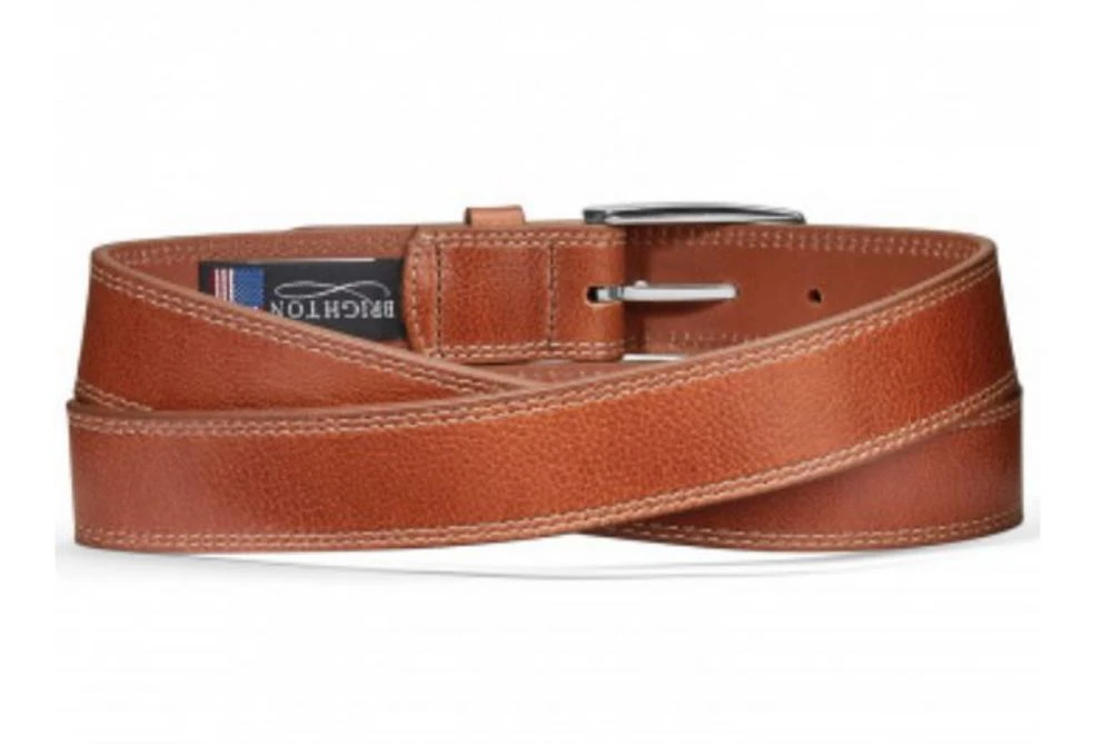 Our craftsmen stitch our leather belts meticulously, using many more stitches than other belt manufacturers use, because we want your belt to last. The leather accent on this buckle adds another artisan touch.
