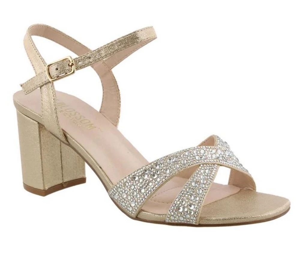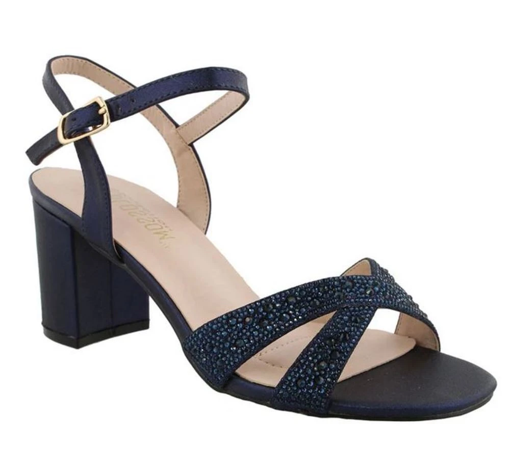 This fancy evening shoe features a block heel and strappy design. Adjustable ankle strap for the perfect fit. Criss cross upper straps with rhinestone embellishments. 3inch heel.