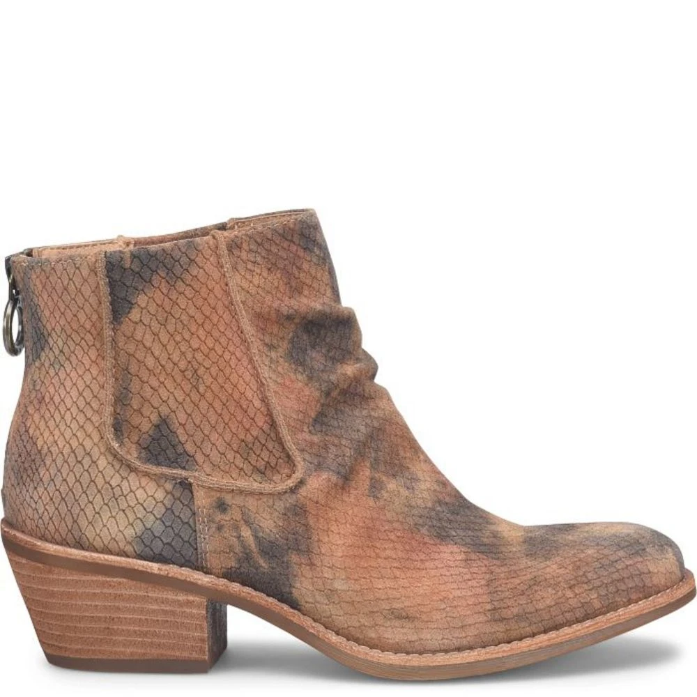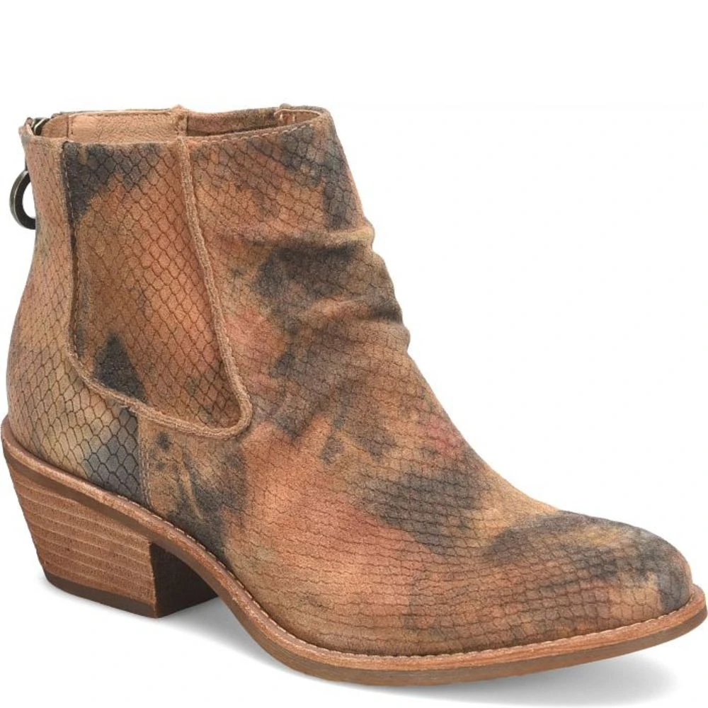 The Andee bootie is sure to stand out from the rest with its multicolor caramel design. Subtle western touches and a back zipper for easy on and off. Features heel and arch support, as well as a cushioned footbed at the ball of foot. Lightweight TPR outsole and a heel height of 2 inches.