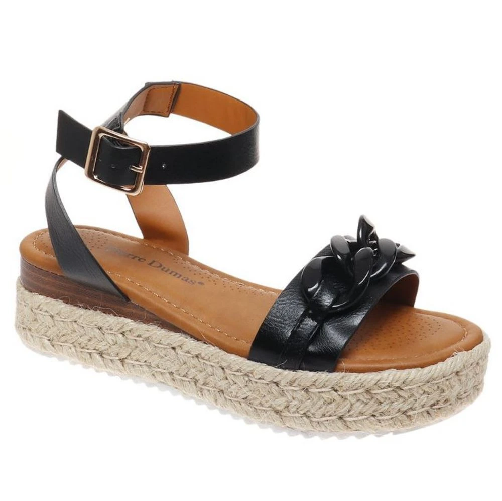 This cute platform sandal features a twisted buckle design on upper and adjustable side buckle for the perfect fit. Faux leather upper and a twisted rope design on platform of shoe. Padded footbed for all day comfort and a 1 inch platform.