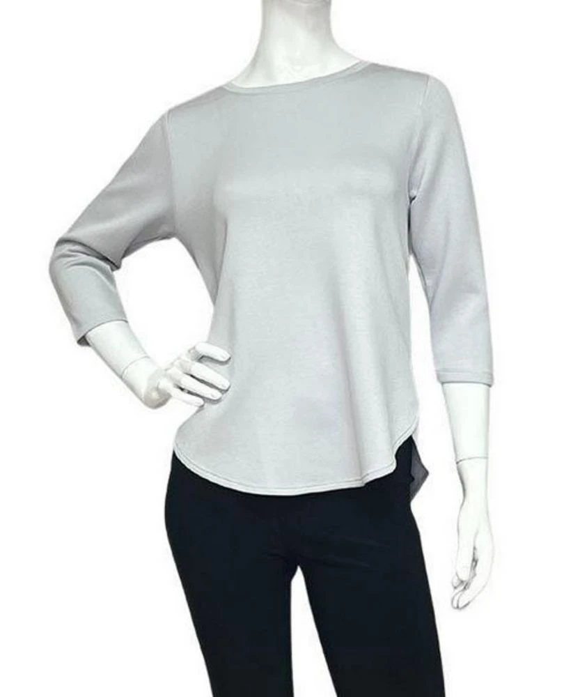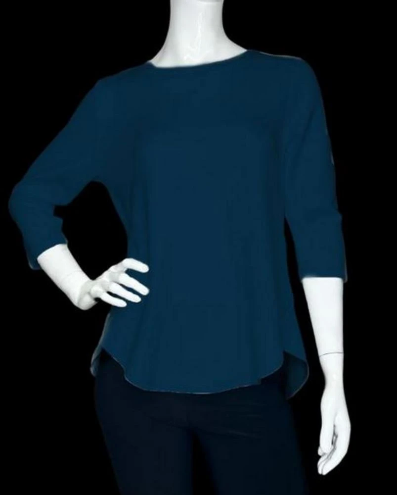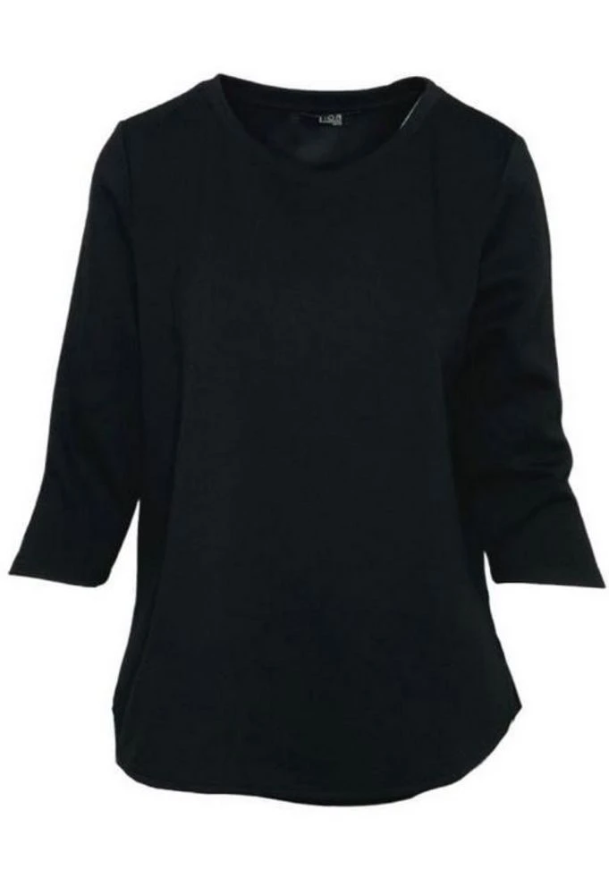 A great basic for your wardrobe. Features a scoop neckline and curve detail at front hem. A slimming silhouette that flatters the midsection and elbow length sleeves. Pair with jeans or shorts. 45% Viscose / 37% Polyester / 10% Modal / 8% Spandex